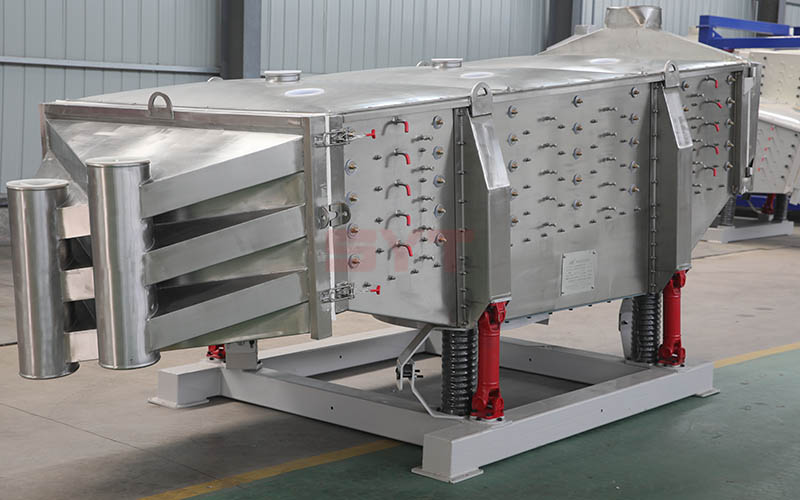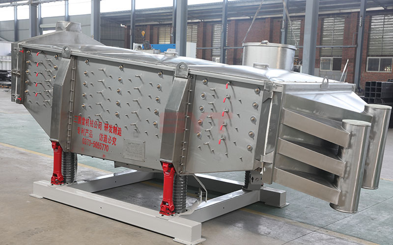 篩機啟動後,篩機搖動體即篩箱在慣性力的作用下作前後往複運動,篩箱帶動篩麵作周期性搖動,從而使篩麵上的物料隨篩箱一同作定向跳躍式運動,期間,小於篩麵孔徑的物理通過篩孔落到下層,成為篩下物,大於篩麵孔徑的物料經連續翻滾跳躍運動後從排料口排出,從而完成篩分工作。