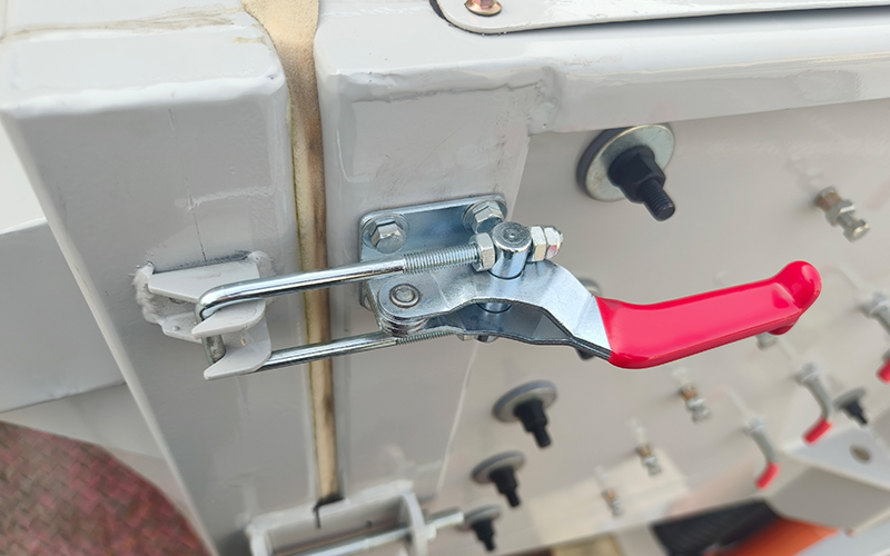 l 進料口:改變了原來依附在後門上的設計,增加了分料板結構,使分料更有效均勻.後門的重量減輕,讓進料一端的搖擺運動更有力,使得投入篩麵的物料更快速的分散篩分。